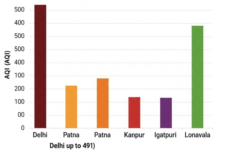 - Delhi often registers AQI above 200–300 in peak months, and even reached 491 in a single day, deep into the “severe‑plus” bracket