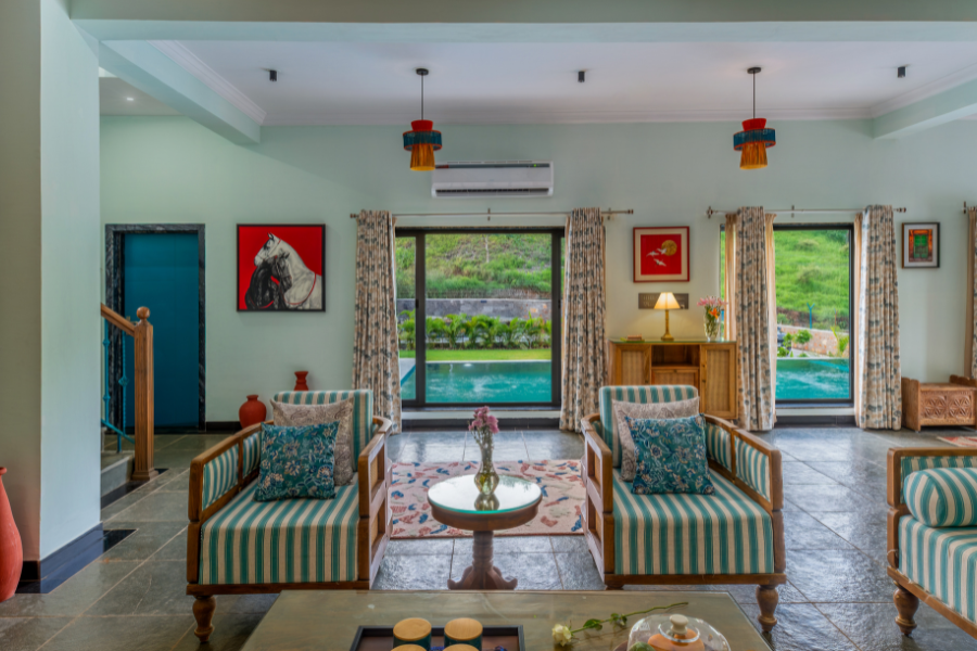 The highlight of this luxury 4 BHK villa in Udaipur with private pool is its serene outdoor area — perfect for refreshing swims, evening conversations, and quiet relaxation under the open sky.