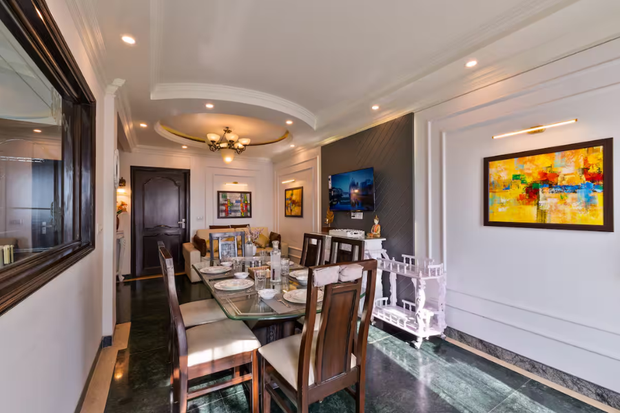 The fully equipped kitchen at SD Cottage adds a warm, homely touch to your stay. Cook your favorite meals, try local produce, or let the in-house chef curate a delicious spread. The adjoining dining area, designed with wood, soft lights, and warm tones, creates the perfect setting for long conversations, laughter-filled dinners, or quiet breakfasts with a view.
