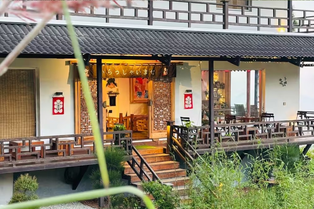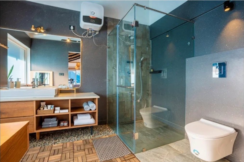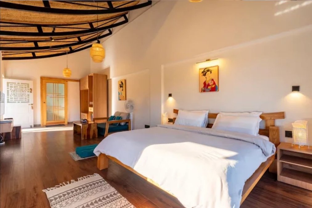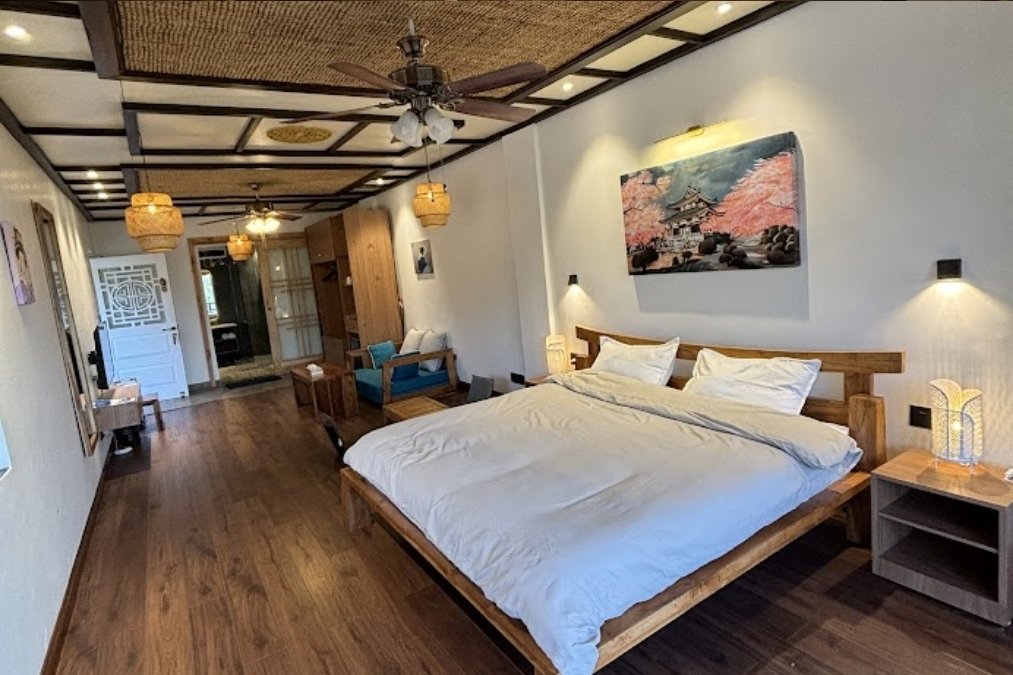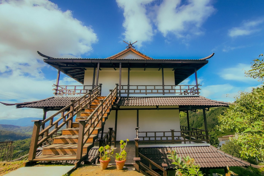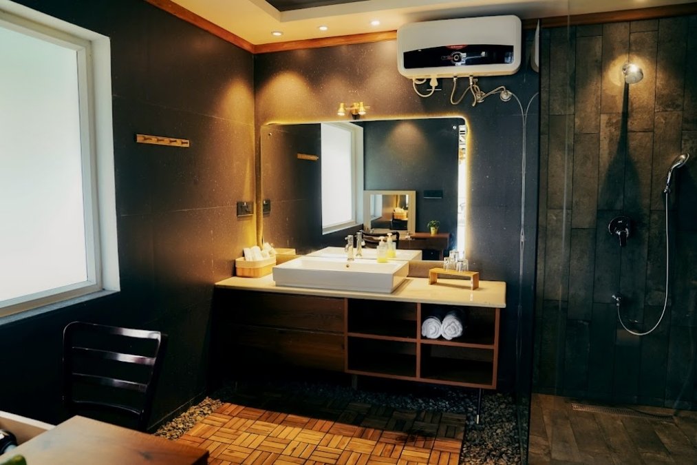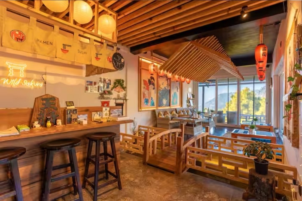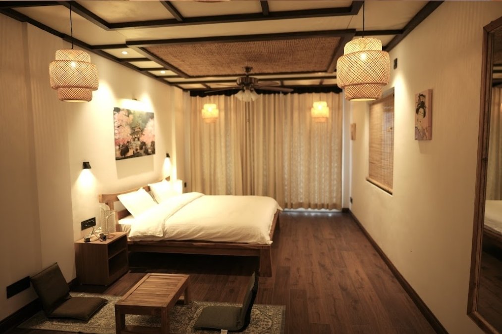Inside, the villa blends minimal Japanese aesthetics with the charm of a Himalayan retreat. Warm wooden textures, soft lighting, elegant details, and calming interiors create an atmosphere of quiet luxury.